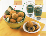 - (4)を5cm角に切り、中央に小さじ1/4程度の(5)を置き、三角に折ってくっつける。必要ならば水を使う。三角の先を下にして人差し指に巻きつけ、両端をとめ、三角の先を少し上に持ち上げて帽子の形にする。