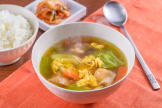 - フライパンにサラダ油を熱し、(1)の玉ねぎ、にんじんをよく炒める。