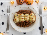 - かぼちゃは種を取り、大きめの一口大に切って耐熱皿にのせ、ふんわりラップをかけて電子レンジ600Wで約5~6分柔らかくなるまで加熱する。一部は皮をはずし、おばけの目、口になるように切る。