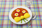 - (1)の具材を皿に盛りつけ、レモンタルタルソースの材料を混ぜ合わせてかける。