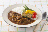 - プレート皿にごはん(分量外)をプリン形に盛り、まわりに(4)のカレーをかける。(5)のミートソースパスタ、(6)のスクランブルエッグ、(8)のハンバーグをそれぞれ6皿に分けて盛りつける。お好みで、食べやすくちぎったレタス、小房に分けてゆでたブロッコリー、ミニトマトなどを添える。