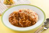- にんじんは1cmの厚さの輪切りにし、花形に型で抜き、じゃがいもは一口大に切る。ブロッコリーは小房に分けて、塩(分量外)を入れた湯でゆでる。マッシュルームは半分に切る。