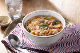 - (2)の鍋にサラダ油大さじ1/2をたして熱し、豚肉、(1)の玉ねぎを入れ、玉ねぎがしんなりするまで炒め、えのきたけを加えてさっと炒める。