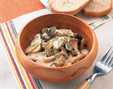 - (2)のフライパンに白ワインを加えて煮立て、アルコール分をとばす。いったん火からおろし、つぶ入りマスタード、マヨネーズ、はちみつ、牛乳を加えてよく混ぜ合わせ、再び火にかけて粘性が出るまで加熱する。