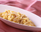 - フライパンにサラダ油を中火で熱し、(1)の玉ねぎを入れ、玉ねぎがすき通るまで炒め、シーフードミックスを加えてえびの色が変わるまで1分半~2分程度弱火~中火で炒める。
