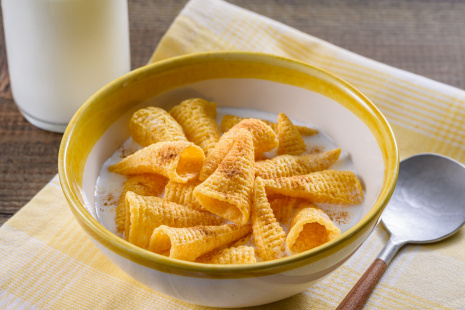 - 器にとんがりコーンを入れ、牛乳をかける。