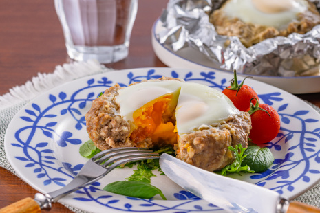 - アルミはくで円柱の型(直径8cm×高さ5cm程度)を3つ作り、(2)のひき肉を入れる。コップなどを使ってひき肉を器状に成形し、くぼみの部分に(1)のトマト、溶けるチーズを重ねて入れ、ウスターソースをかけて卵を割り入れる。
