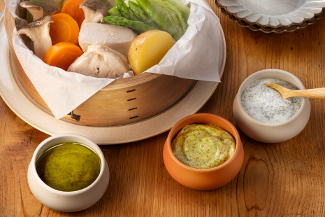 - 鍋にお湯を沸かし、(3)のせいろを置く。強火で20~25分、鶏肉と野菜に火が通るまで蒸す。