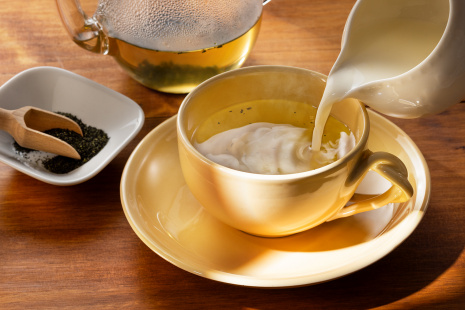 - (1)をカップに注ぎ、温めた牛乳、グラニュー糖を加える。