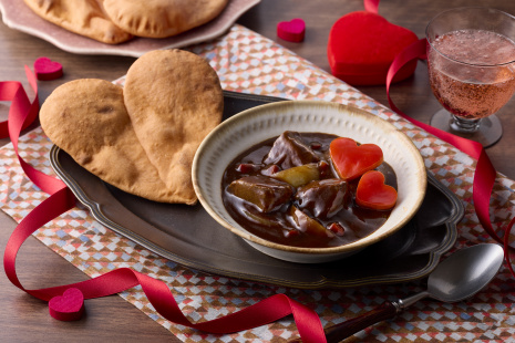 - 器に(4)のカレーを盛り、(3)のハート型のパプリカを飾る。(6)のナンといっしょにいただく。
