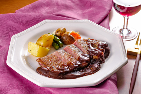 - (5)のステーキをスライスし、(4)の野菜と共に皿に盛り、(3)のビーフシチューソースをかける。