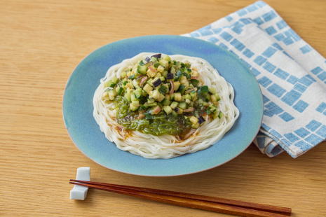 - 器に水気を切った(2)のそうめんを盛り、めかぶ、冷しゃぶドレッシング大さじ3、(1)をかける。