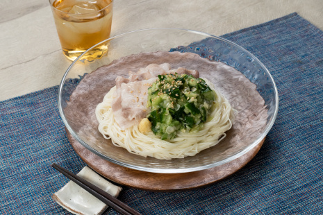 - 器に水気を切った(4)のそうめんを盛りつける。水気を切った(3)の豚肉、(2)の野菜ダレをかけ、いりごまをちらす。