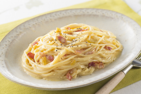 - ボウルに卵黄、パルメザンチーズ、粗柚子こしょう、生クリームを混ぜ合わせておく。