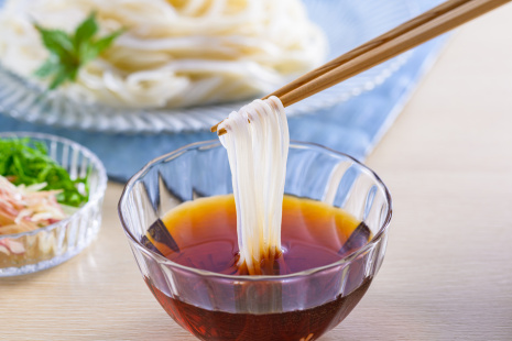- お好みできざんだ大葉やみょうがなどの薬味を添えて、(1)のそうめんをめんつゆにつけていただく。
