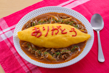- 皿の中央に(6)のオムライスをのせて形をととのえ、トマトケチャップでデコレーションする。両側に(4)のハヤシライスソースを盛り、パセリを振る。