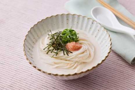 - からし明太子ペースト小さじ1ずつ、大葉、きざみのりをトッピングする。