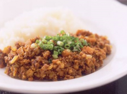 - ひき肉を加えて炒め、(1)の豆腐をくずしながら加えてさらに炒める。