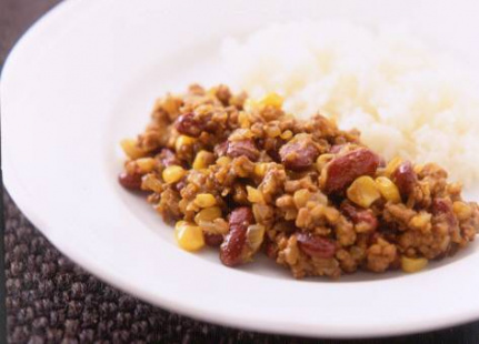 - ひき肉を加えて肉の色が変わるまで炒め、水気を切ったキドニービーンズを加えてさらに炒める。
