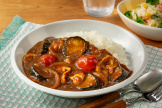 - 耐熱皿の底に(2)のなすの半分を敷き詰め、残ったカレーの半量をのせて広げる。同様に残りのなす、カレーの順に重ね、上に溶けるチーズをちらし、オーブントースターで約8分焼き色がつくまで焼く。